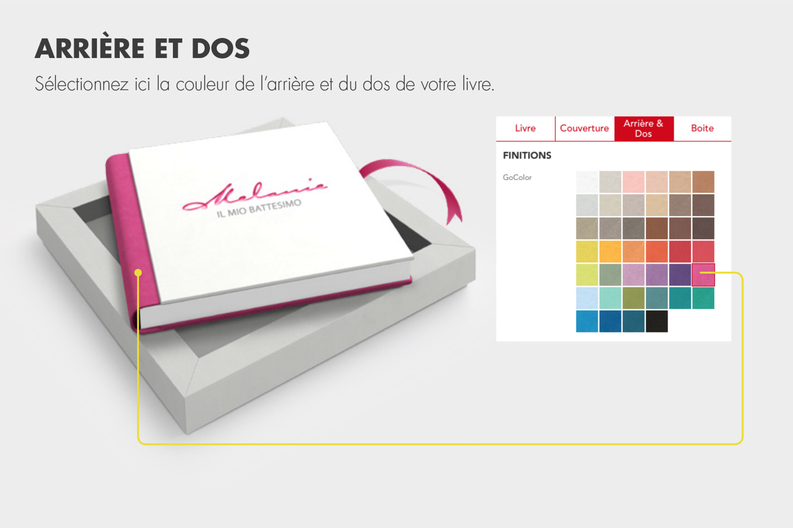 Choisissez pour la couverture parmi l’une des 40 couleurs disponibles, cette dernière peut être différentes de la couleur utilisée pour l’arrière et le dos, cette option vous permet de faire varier les choix sans aucune restriction de combinaisons. L’élégante surimpression en couleurs et verni en relief est également disponible, vous offrant ainsi une variété de personnalisations supplémentaires.